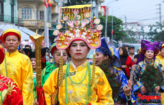 Đoàn rước đi đầu là những nhân vật mô phỏng các vị quan hộ giá.
