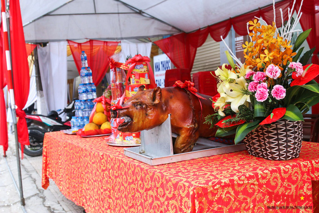 Trên đường có đoàn rước đi qua, các gia đình bày biện mâm lễ trước cửa nhà để cầu bình an, tài lộc