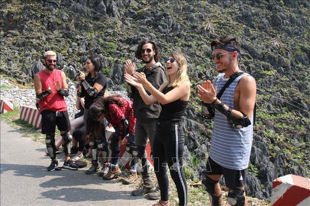 Đoàn du khách quốc tế trải nghiệm tại khu vực đèo Mã Pí Lèng, huyện Mèo Vạc (Hà Giang).