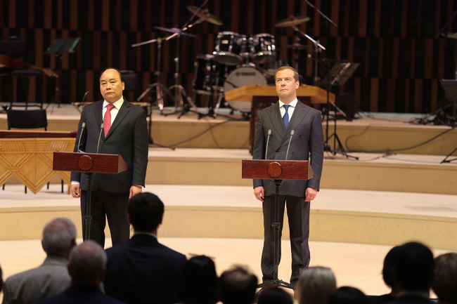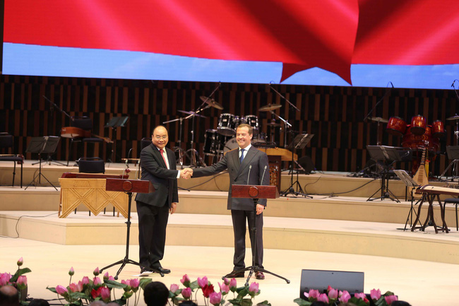 Thủ tướng Nguyễn Xuân Phúc và Thủ tướng Nga D.A. Medvedev dự, hát Quốc ca hai nước tại Lễ khai mạc Năm Việt Nam tại Nga và Năm Nga tại Việt Nam