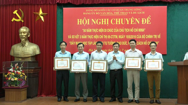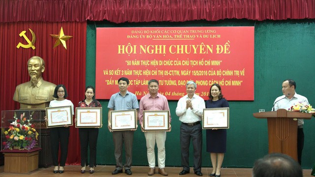 Hội nghị cũng đã biểu dương, khen thưởng 14 tổ chức đảng và 16 cá nhân thuộc Đảng bộ Bộ VHTTDL "có thành tích xuất sắc trong học tập và làm theo tư tưởng, đạo đức, phong cách Hồ Chí Minh giai đoạn 2016 - 2019".