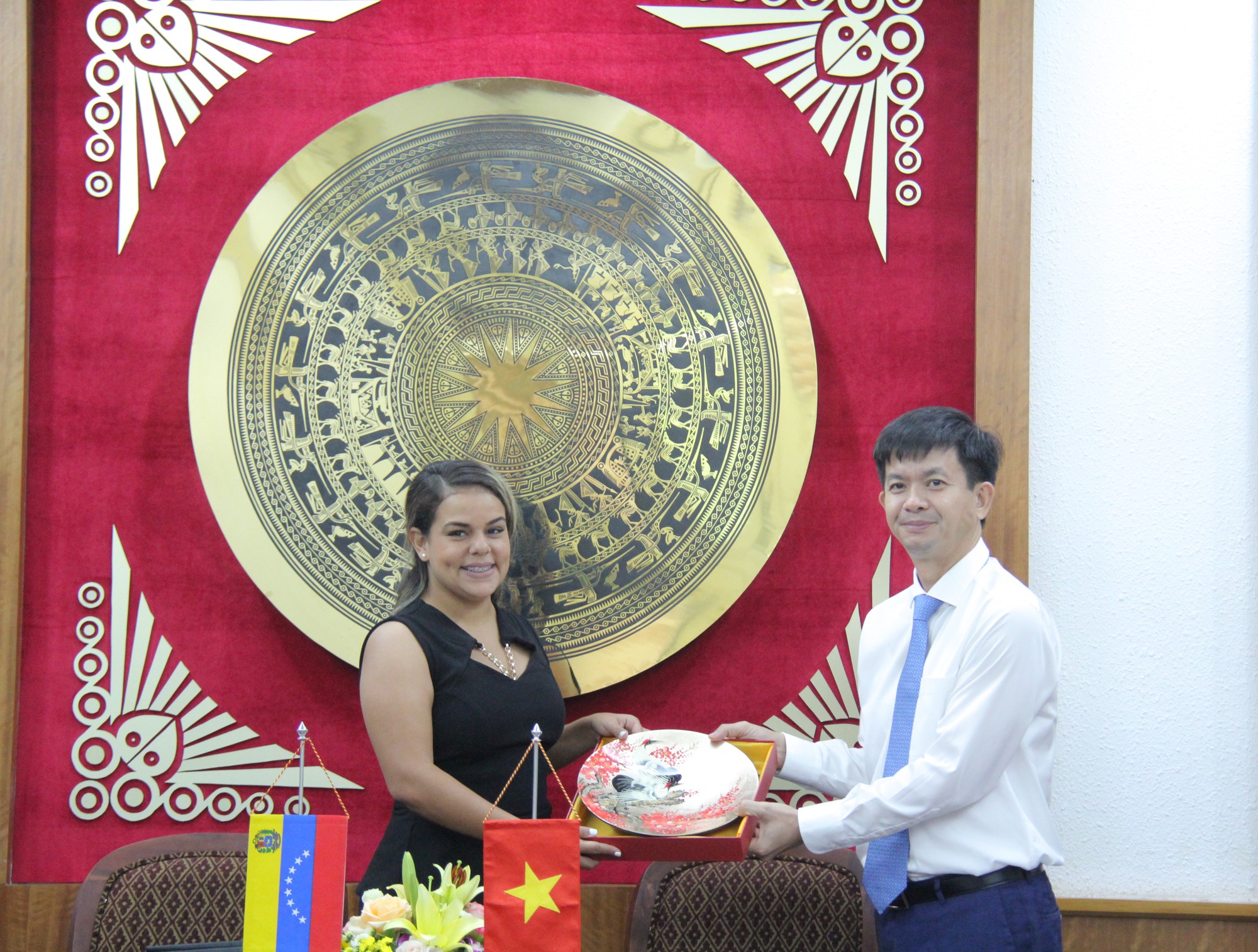 Thứ trưởng Lê Quang Tùng và bà Rodbexa Poleo, Bí thư thứ nhất Đoàn Thanh niên Đảng Xã hội chủ nghĩa Thống nhất, kiêm Thứ trưởng Bộ Văn hóa Venezuela.