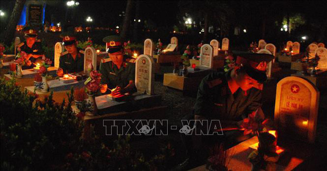 Hơn 800 đoàn viên, thanh niên thắp nến tri ân tại trên 10.700 ngôi mộ ở Nghĩa trang Liệt sỹ Quốc gia Đường 9. Ảnh: Thanh Thủy/TTXVN