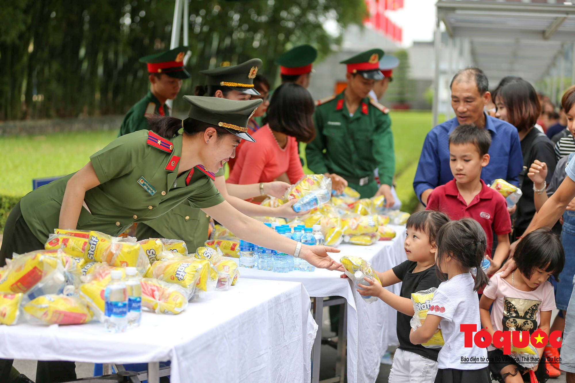 Lực lượng an ninh phát nước và bánh miễn phí cho người dân.