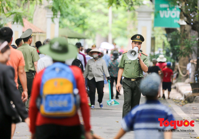 Lực lượng an ninh nhắc nhờ bà con xếp hàng ngay ngắn để vào lăng viếng Chủ tịch Hồ Chí Minh.