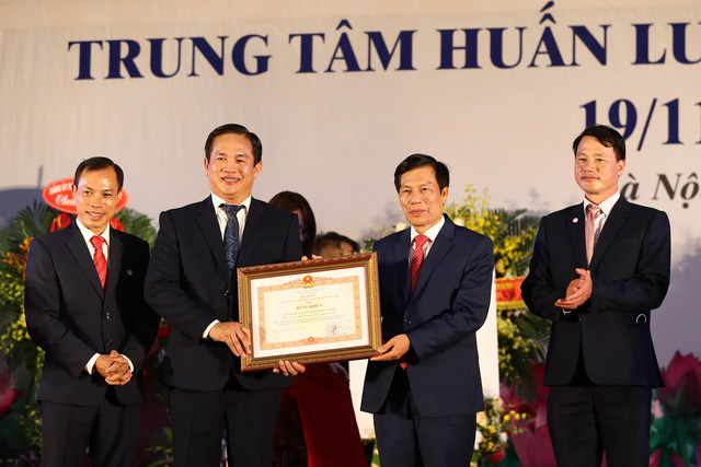 Bộ trưởng trao bằng khen của Thủ tướng Chính phủ cho Trung tâm Huấn luyện thể thao quốc gia Hà Nội. Ảnh: Nam Nguyễn
