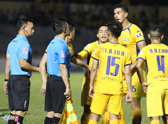 Cầu thủ SLNA liên tục vây lấy trọng tài để phản ứng. Ảnh: Ngọc Dương/Zing.vn