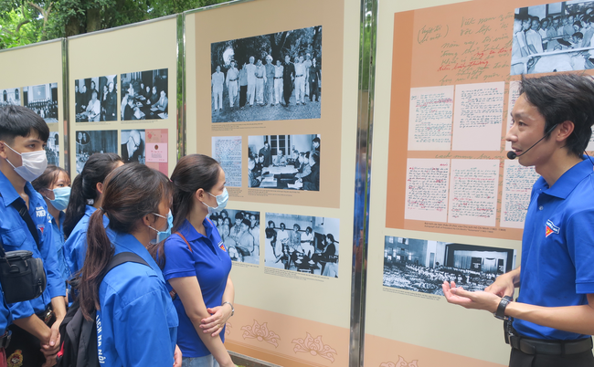 Các đoàn viên thanh niên hào hứng nghe thuyết minh và thăm quan Triển lãm về Bác Hồ. Ảnh: Kim Quý.