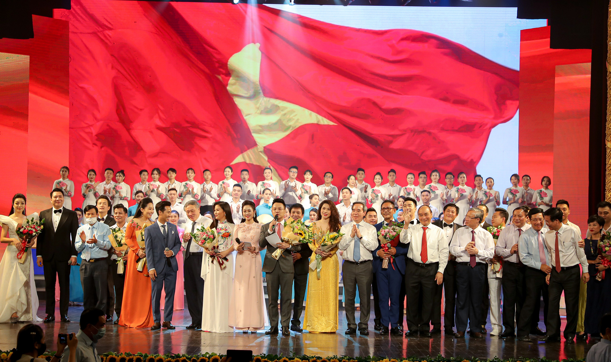 Các đồng chí lãnh đạo Đảng, Nhà nước lên sân khấu tặng hoa chúc mừng các nghệ sĩ.
