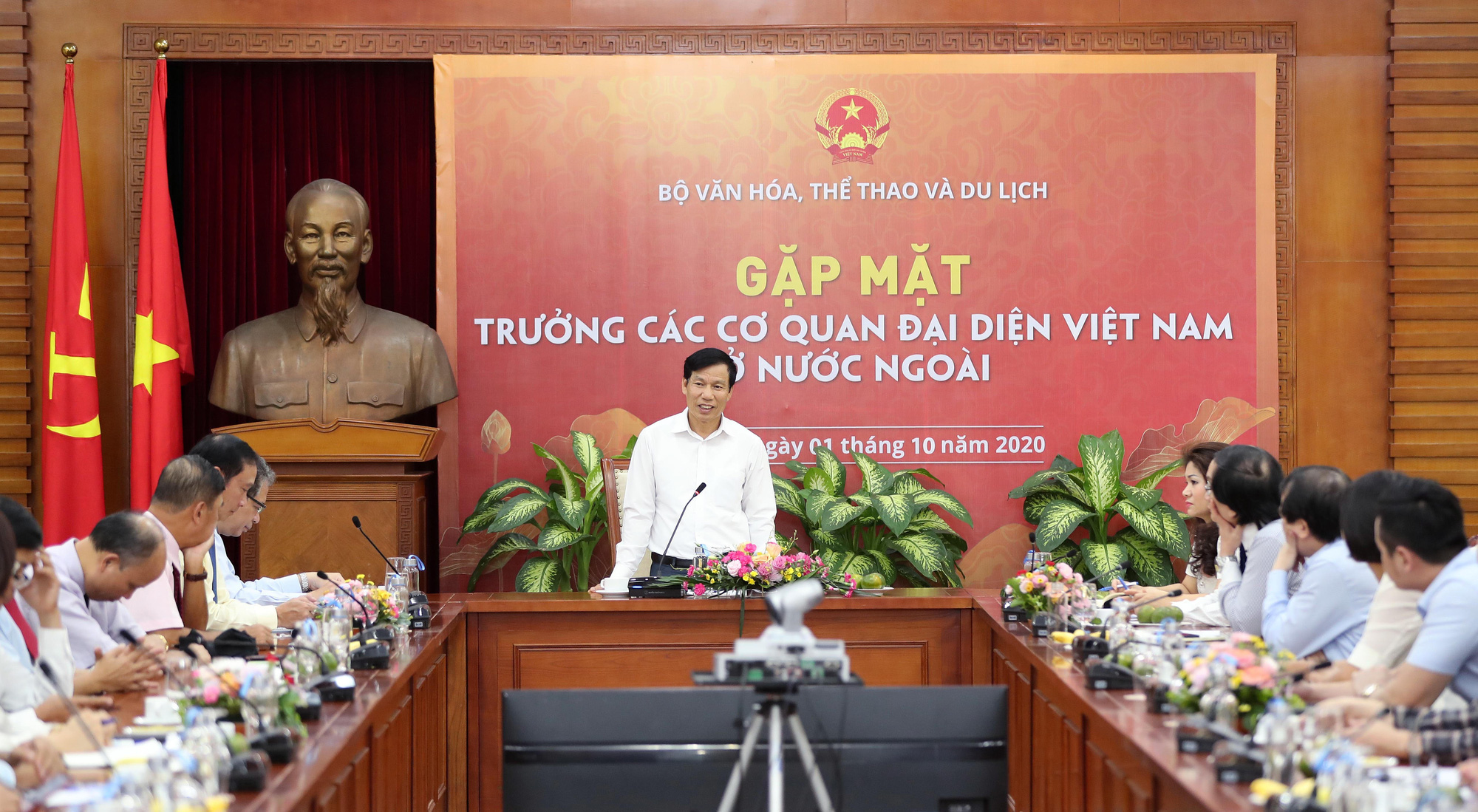 (TTCNTT) - Sáng 1/10, tại trụ sở Bộ Văn hóa, Thể thao và Du lịch, Ủy viên Trung ương Đảng, Bộ trưởng Bộ VHTTDL Nguyễn Ngọc Thiện đã chủ trì buổi gặp mặt với các Trưởng Cơ quan đại diện Việt Nam ở nước ngoài nhiệm kỳ 2020-2023 do Thứ trưởng Bộ Ngoại giao Đặng Minh Khôi làm trưởng đoàn.