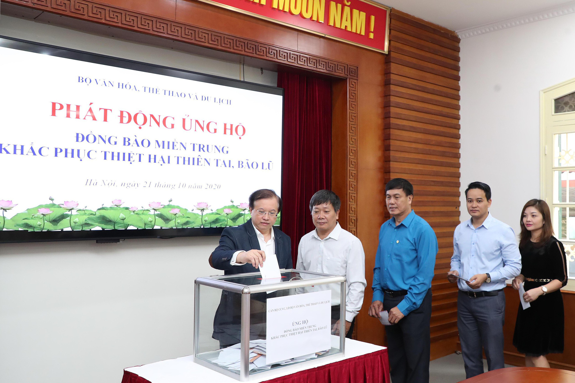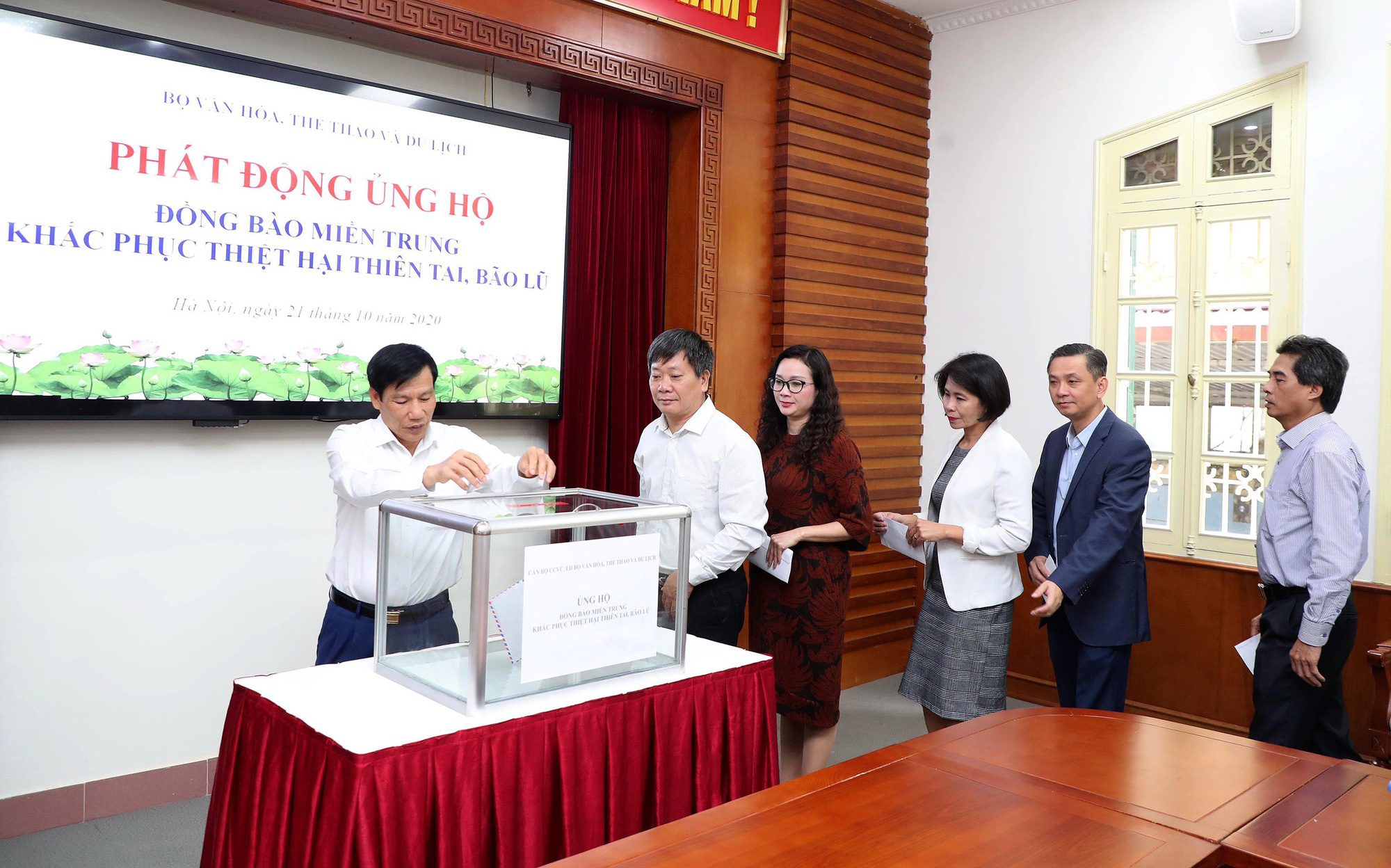 Tại buổi phát động, đại diện các đơn vị thuộc Bộ VHTTDL đã ủng hộ đồng bào miền Trung khắc phục thiệt hại thiên tai, bão lũ.