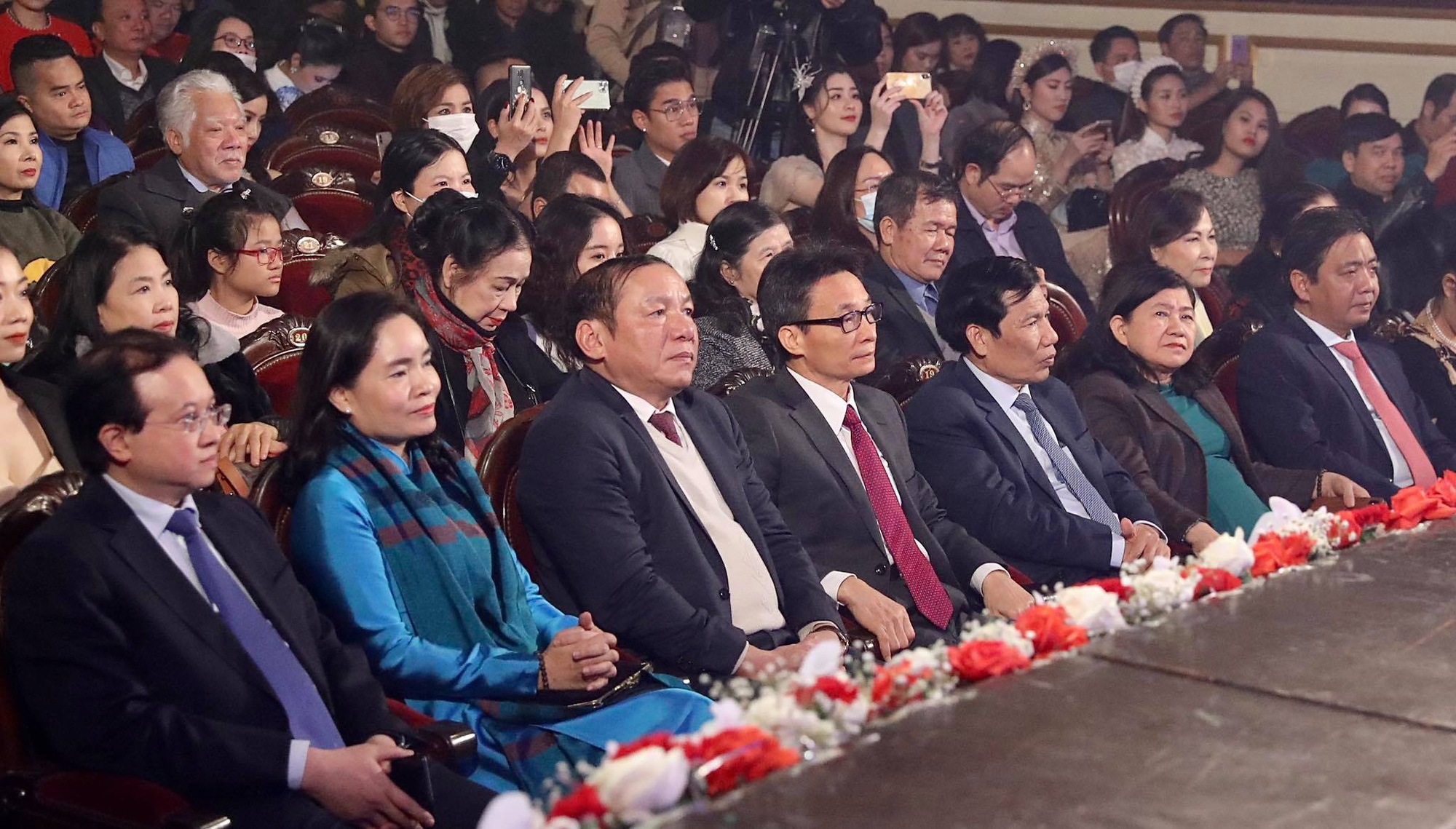 Phó Thủ tướng Chính phủ Vũ Đức Đam va Bộ trưởng Bộ VHTTDL Nguyễn Ngọc Thiện tặng hoa cho các nghệ sĩ