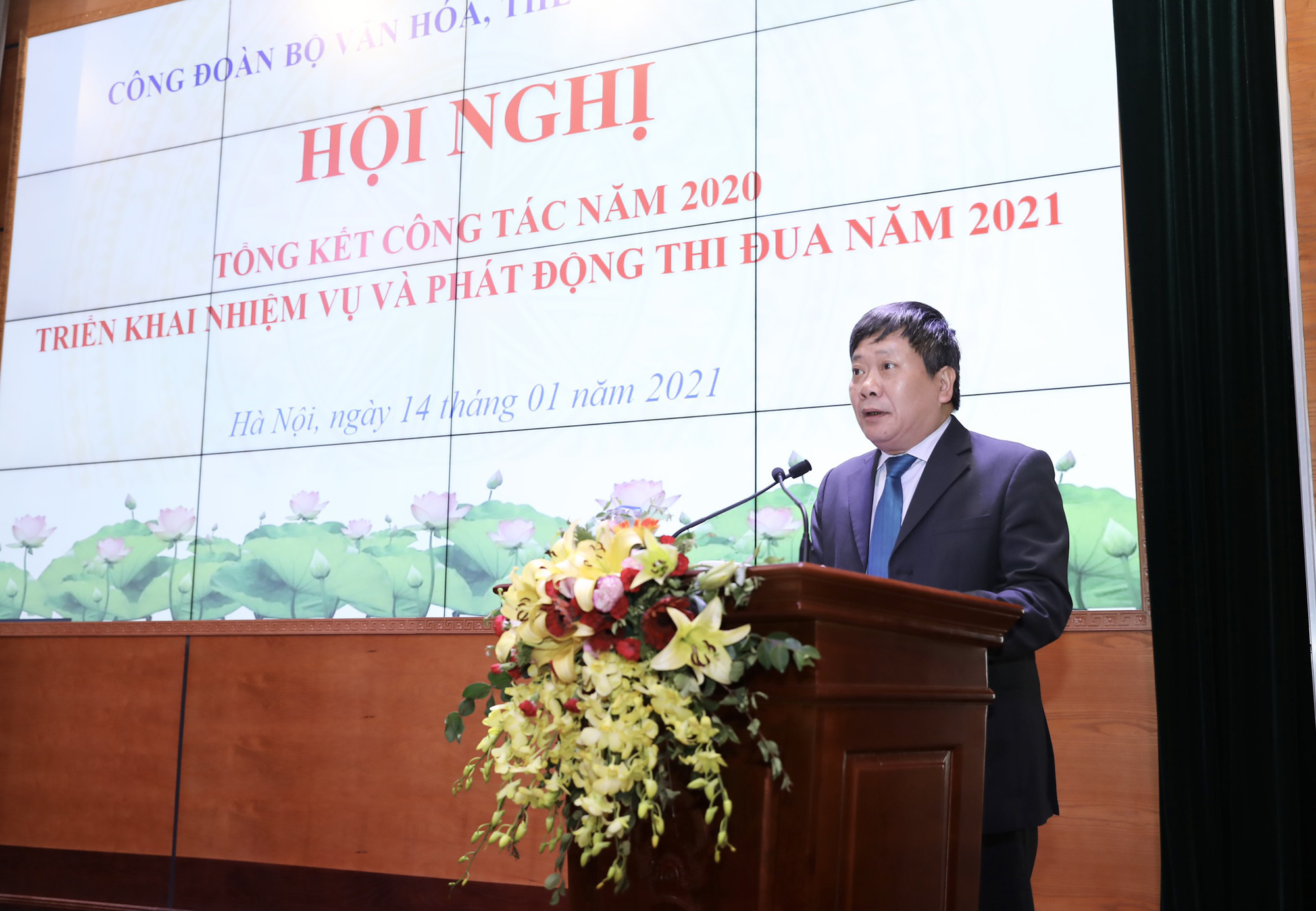 Trong năm 2021, Công đoàn Bộ VHTTDL phấn đấu thực hiện tốt 11 nhiệm vụ trọng tâm. Trong đó, Công đoàn Bộ tích cực vận động cán bộ, đoàn viên công đoàn nêu cao tinh thần trách nhiệm trong tham mưu, nghiên cứu, xây dựng chính sách, pháp luật liên quan trực tiếp đến quyền, lợi ích hợp pháp, chính đáng của người lao động và tổ chức các hoạt động thiết thực vì lợi ích đoàn viên. Chăm lo đời sống vật chất, tinh thần cho cán bộ, công chức, viên chức, người lao động nhất là trong dịp Tết Tân Sửu - 2021 đồng thời thực hiện tốt công tác phòng, chống dịch Covid-19.