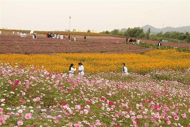 Du khách đến tham quan đồi hoa Xuân thị xã Thái Hòa (Nghệ An). (Ảnh: Văn Tý/TTXVN)