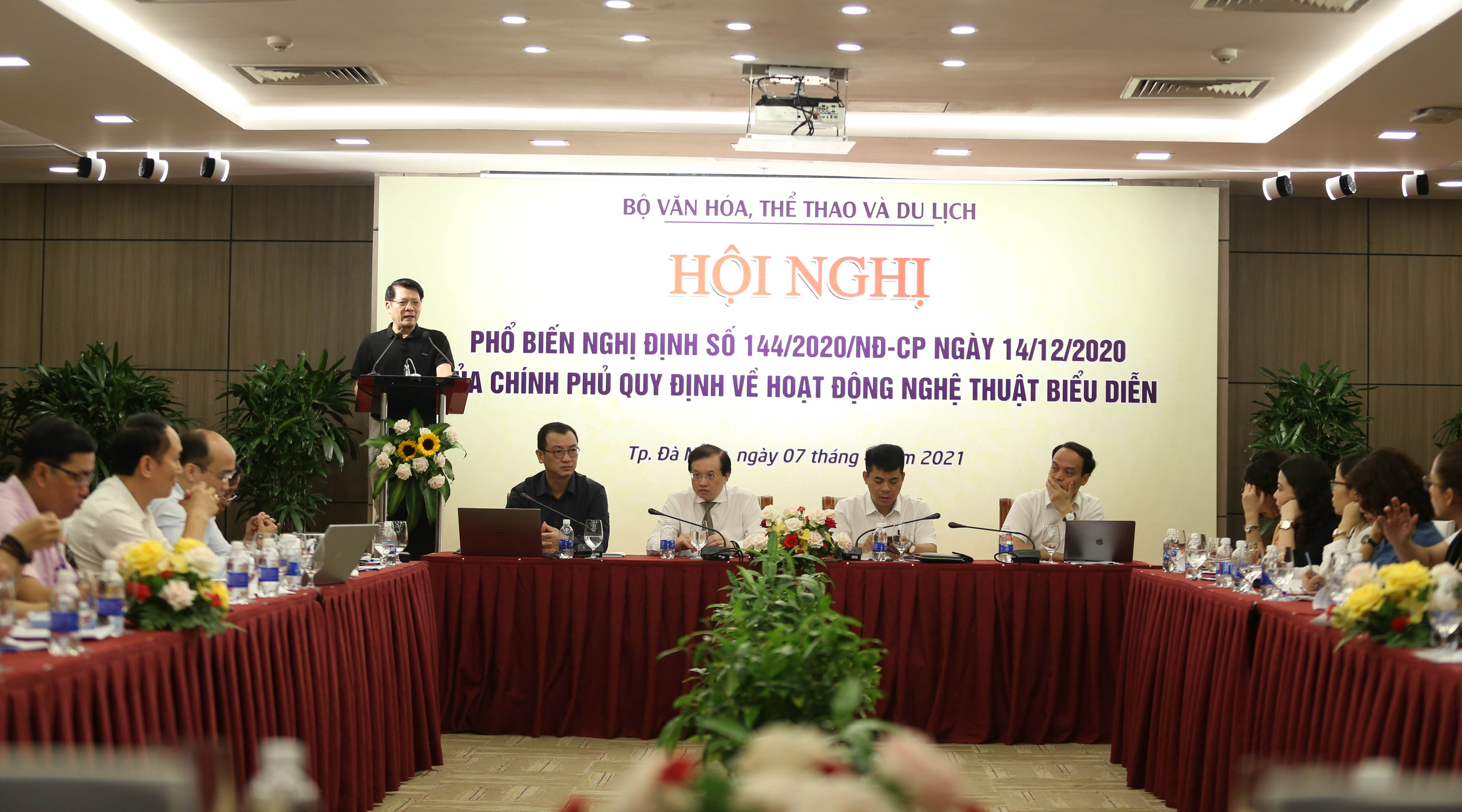 "Tiếp theo hội nghị được tổ chức ngày 25/3/2021 ở Hà Nội, hôm nay Bộ VHTTDL tổ chức Hội nghị phổ biến Nghị định số 144 khu vực miền Trung tại TP Đà Nẵng. Thông qua hội nghị tập huấn, các học viên được cung cấp và trang bị những nội dung cốt lõi của Nghị định 144, những quy định mới so với các Nghị định trước, để từ đó đảm bảo sự thống nhất trong công tác quản lý nhà nước; tạo thuận lợi cho các cơ quan, tổ chức, cá nhân thực hiện trong thời gian tới", Thứ trưởng Tạ Quang Đông cho biết.