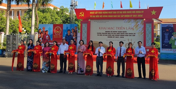 (TTCNTT) - Triển lãm tranh cổ động tấm lớn tuyên truyền bầu cử đại biểu Quốc hội khóa XV và đại biểu HĐND các cấp nhiệm kỳ 2021-2026 do Cục Văn hóa cơ sở (Bộ VHTTDL) phối hợp Sở VHTTDL tỉnh Bình Phước tổ chức đã chính thức khai mạc sáng 25/4 tại Quảng trường 23-3 (TP. Đồng Xoài, tỉnh Bình Phước). Phó Cục trưởng Cục Văn hóa cơ sở Lương Đức Thắng, Phó Chủ tịch UBND tỉnh Bình Phước Trần Tuyết Minh dự và cắt băng khai mạc triển lãm.