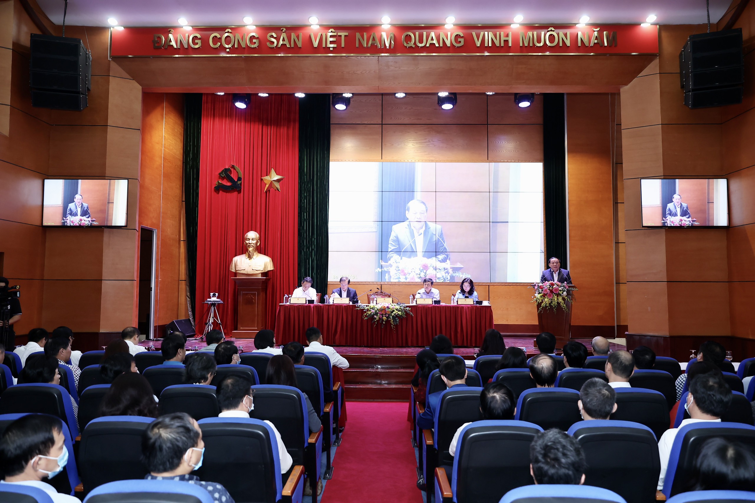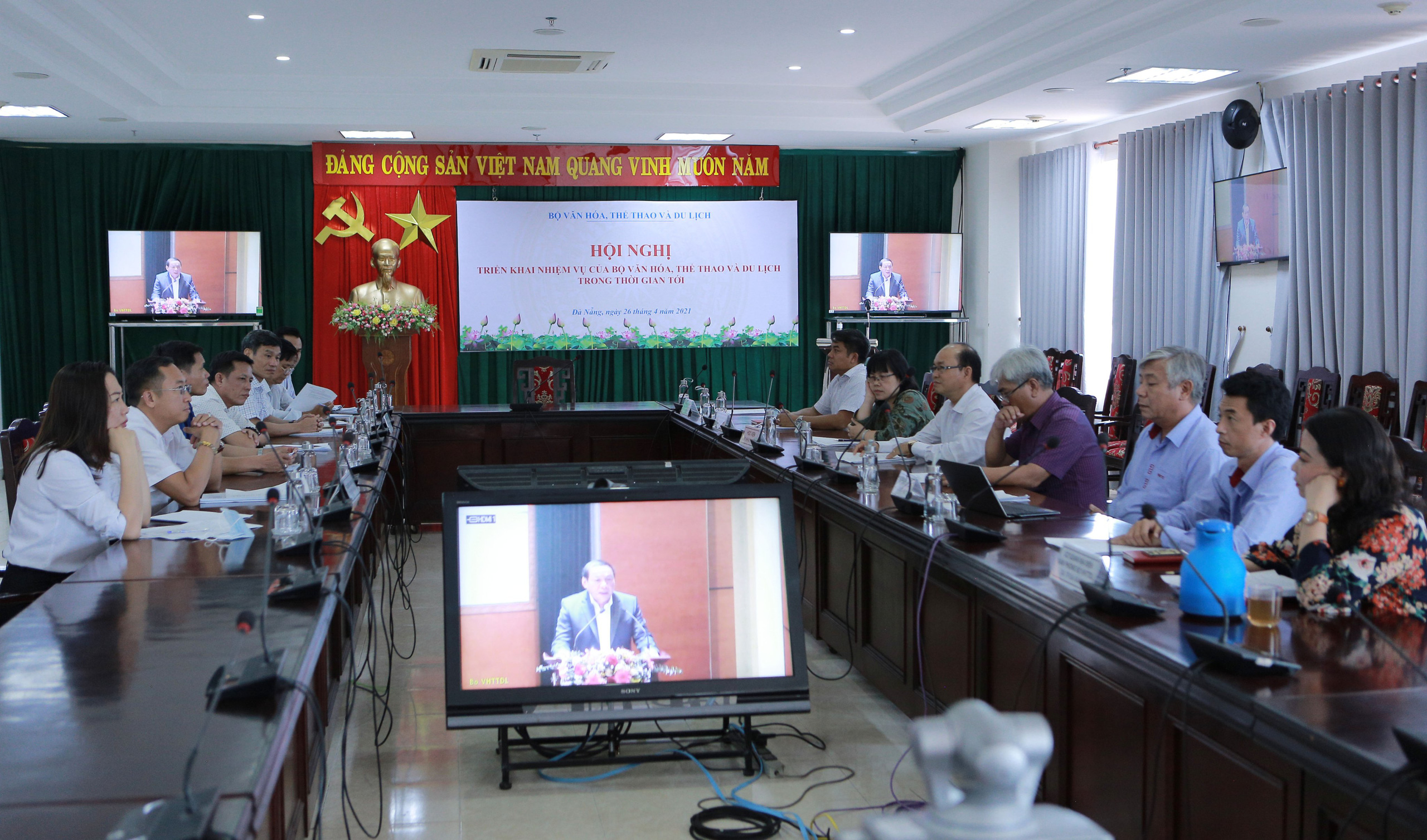Uỷ viên BCH Trung ương Đảng, Bộ trưởng Bộ VHTTDL Nguyễn Văn Hùng; các Thứ trưởng Bộ VHTTDL: Thứ trưởng Tạ Quang Đông; Thứ trưởng Trịnh Thị Thuỷ; Thứ trưởng Đoàn Văn Việt; Thứ trưởng Hoàng Đạo Cương đã chủ trì Hội nghị tại điểm cầu Hà Nội.