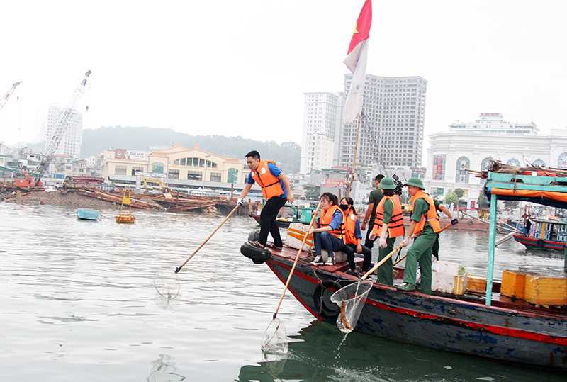 Đoàn viên, thanh niên, cán bộ, chiến sĩ biên phòng vớt rác ven bờ Vịnh Hạ Long trong Chiến dịch "Hãy làm sạch biển" năm 2019. Ảnh: Yến Vy