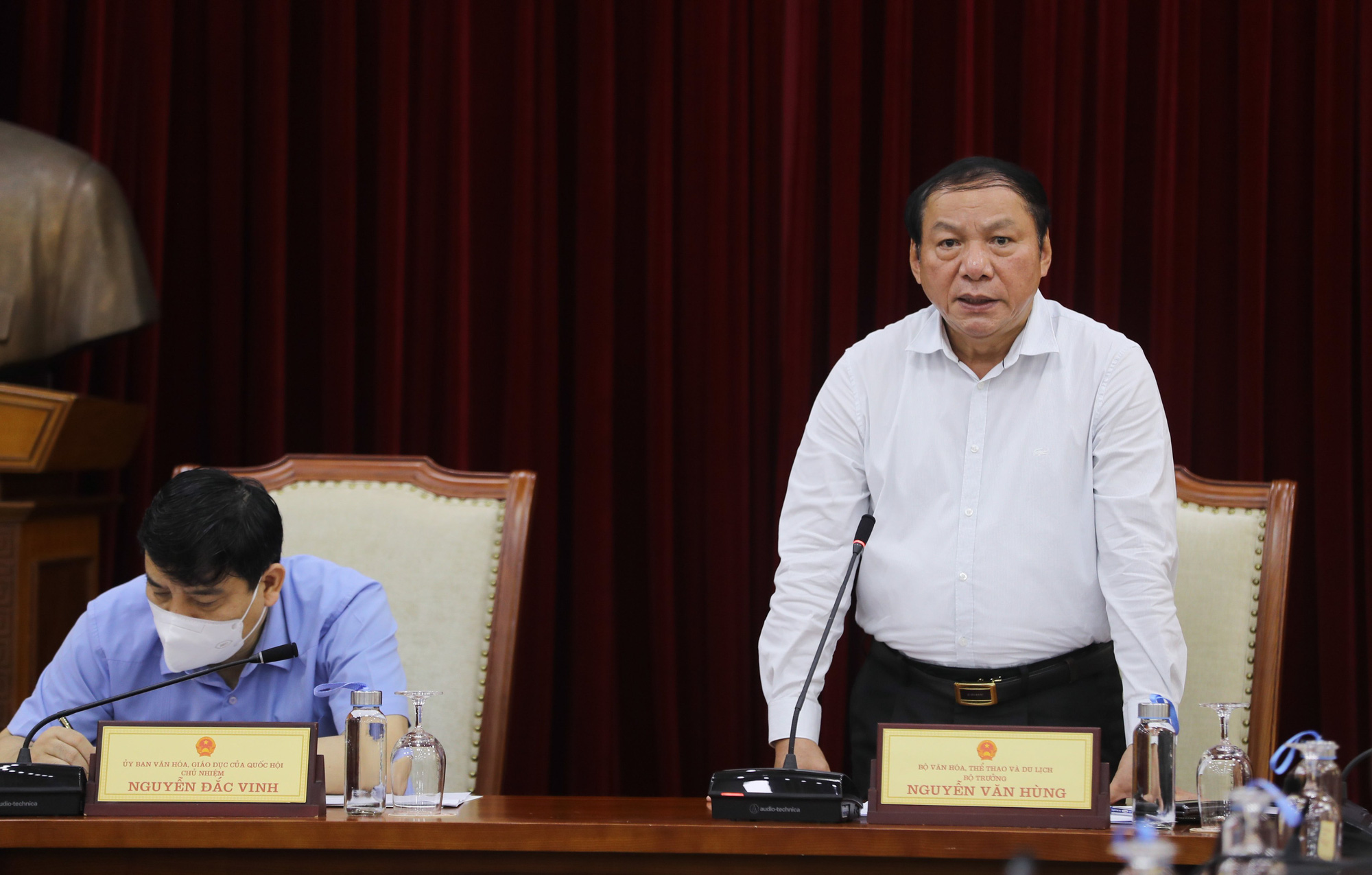 Bộ trưởng Bộ VHTTDL Nguyễn Văn Hùng và Chủ nhiệm Uỷ ban Văn hoá, Giáo dục của Quốc hội Nguyễn Đắc Vinh chủ trì buổi làm việc. Ảnh: Nam Nguyễn