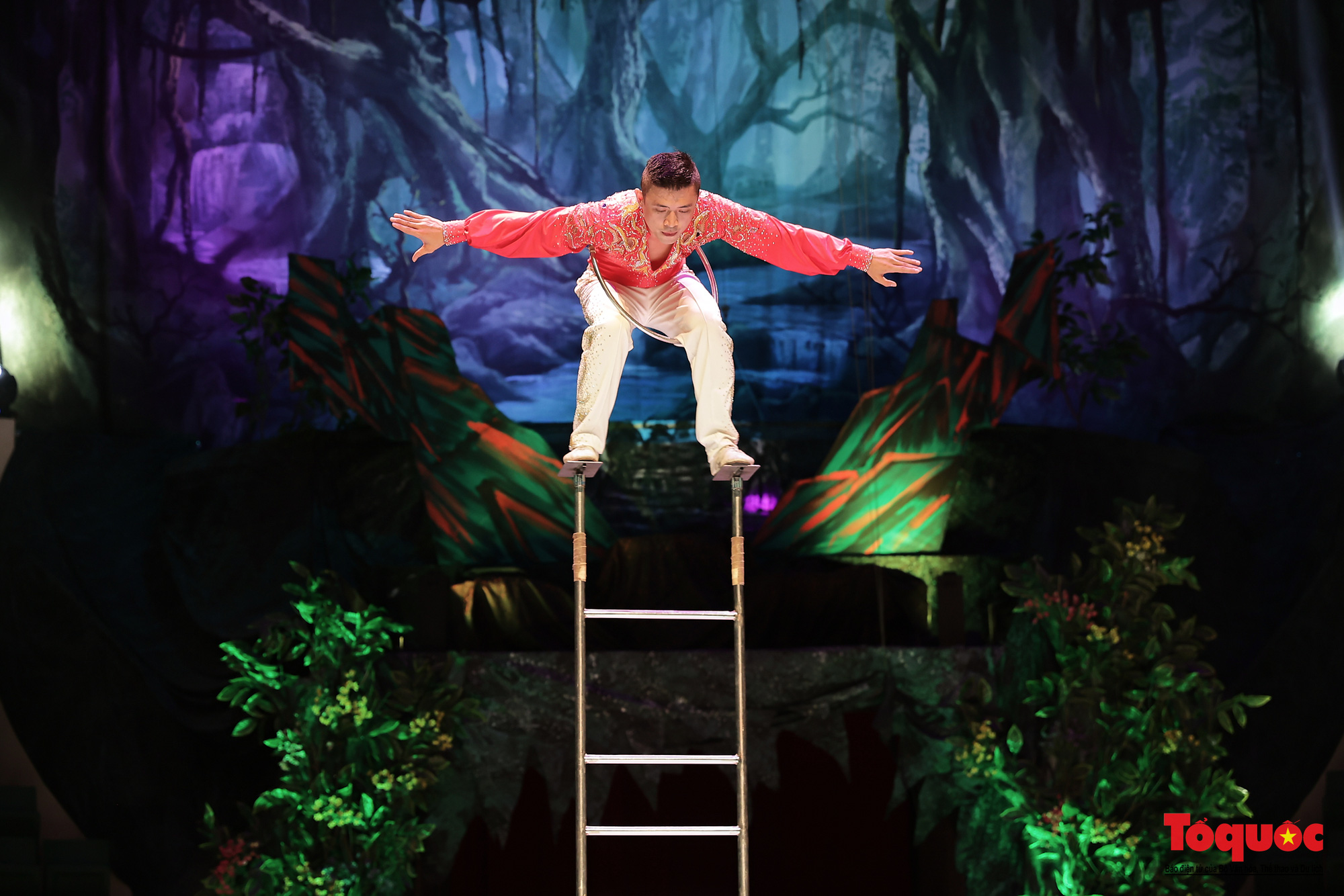 Tiết mục xiếc "Thăng bằng trên thang" của nghệ sĩ Việt Cường tại điểm cầu của Liên đoàn Xiếc Việt Nam.